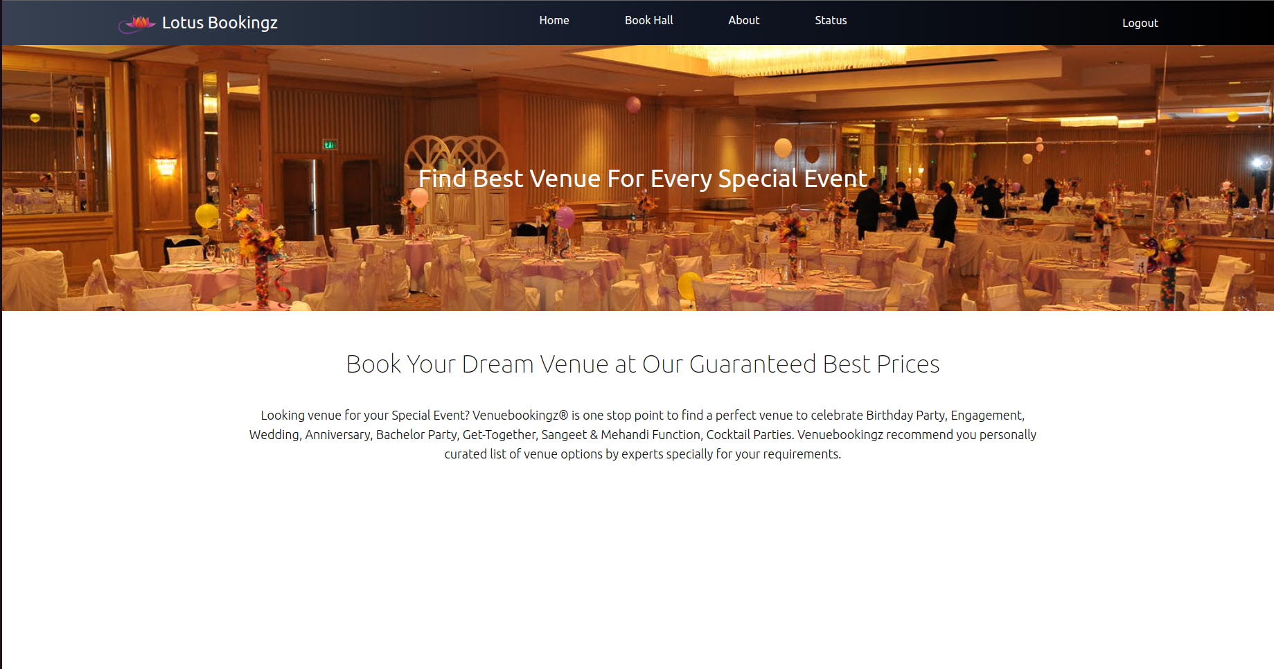 Hall booking is the website on which the admin can add the conference hall and edit them and the user can book the hall and also check the status of the booked hall that it's accepted or rejected